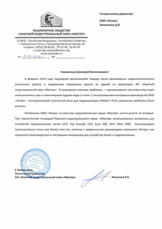 "...с уверенностью рекомендуем компанию "ИНГРИ" как надежного производителя и поставщика материалов для устройства полов и гидроизоляции"